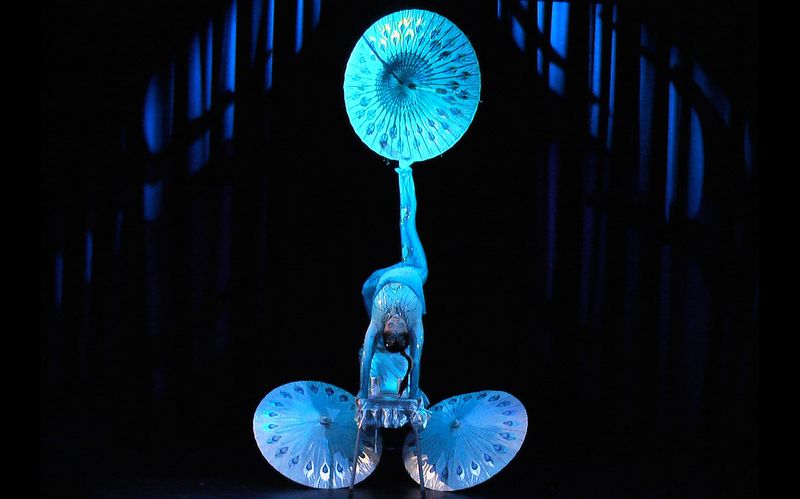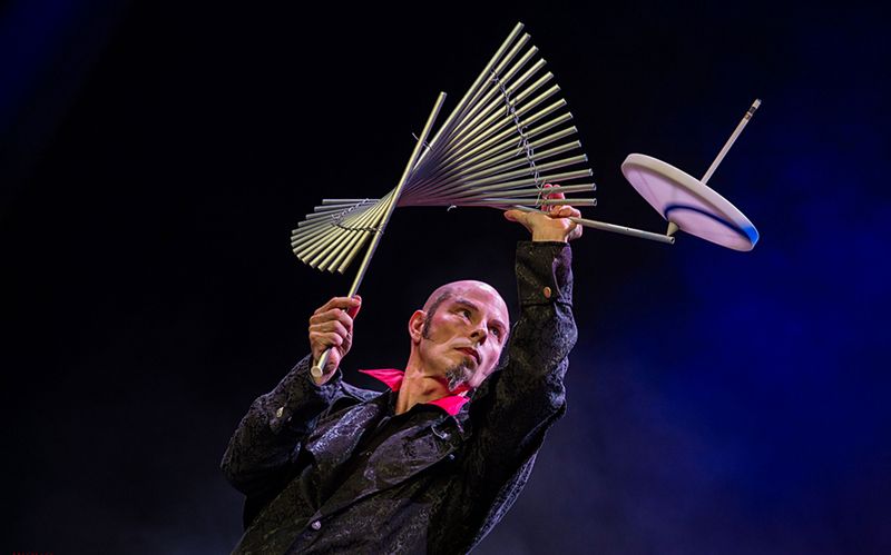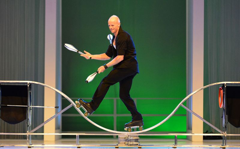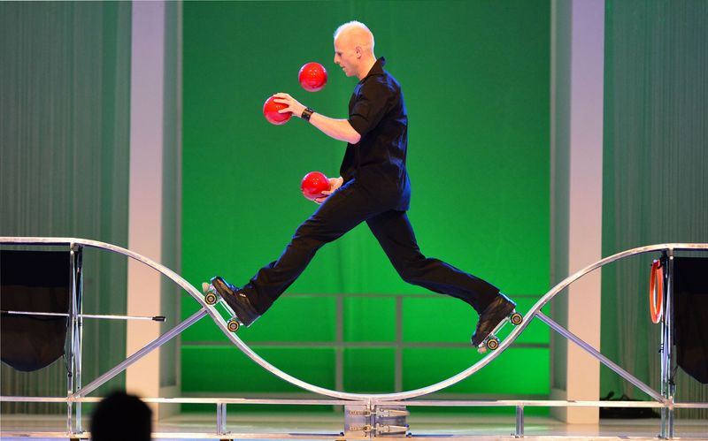 Virtuose Jonglage mit Bällen, Keulen, Diabolo oder anderen Objekten.