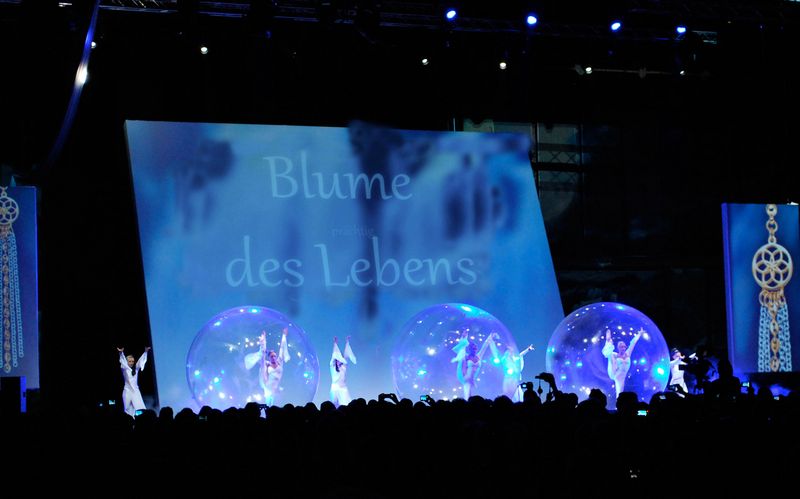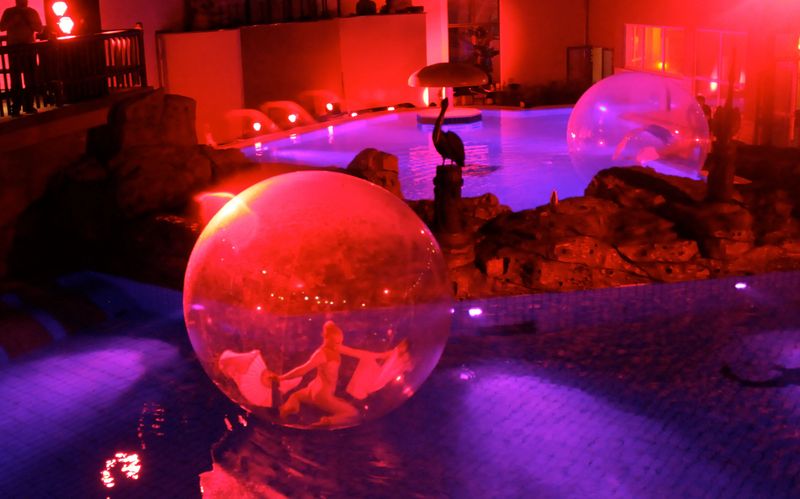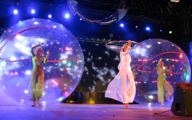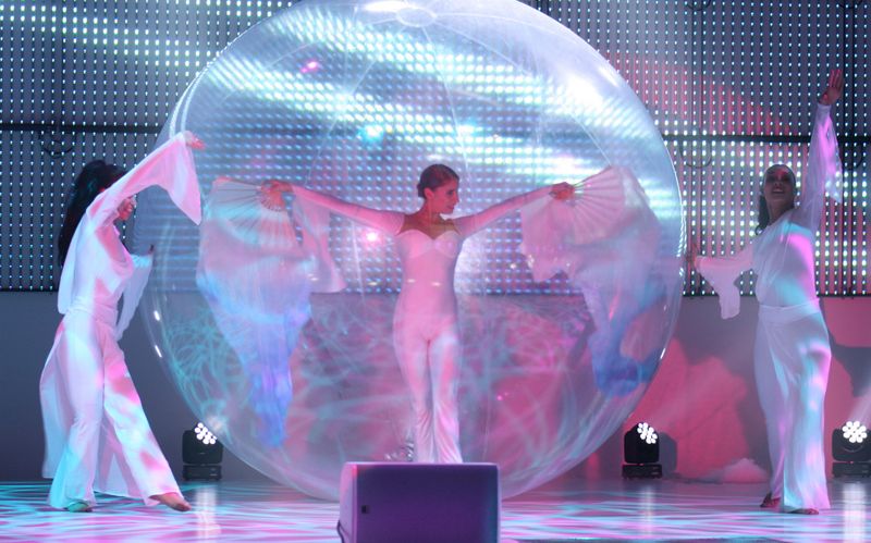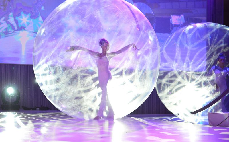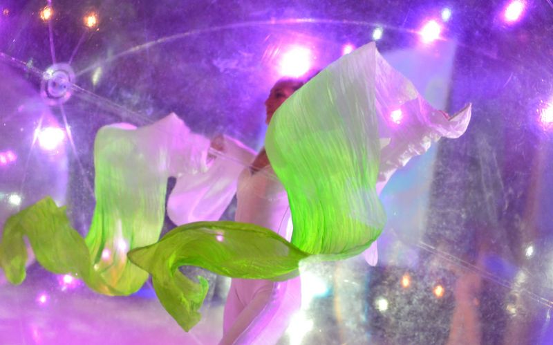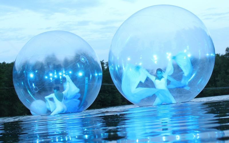 Effektvoll spiegeln sich Lichtreflexe auf den 2,5 m großen transparenten Bällen.