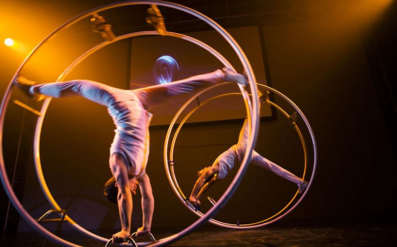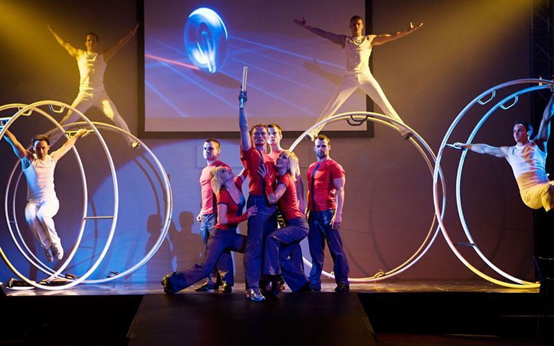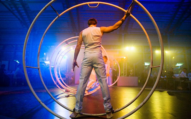Wie inszeniert man die Übergabe eines Staffelstabes in einem Audi Autohaus? Uns fiel dazu Folgendes ein: Parkour-Läufer, Free-Runner und „Tricker“ starten auf der Bühne und machen sich auf den Weg durch das Autohaus. In Anlehnung an das Veranstaltungsmotto „Das Rad der Zeit“ und die Ringe des Audi-Logos ergänzen Rhönrad-Artisten die Szenerie.