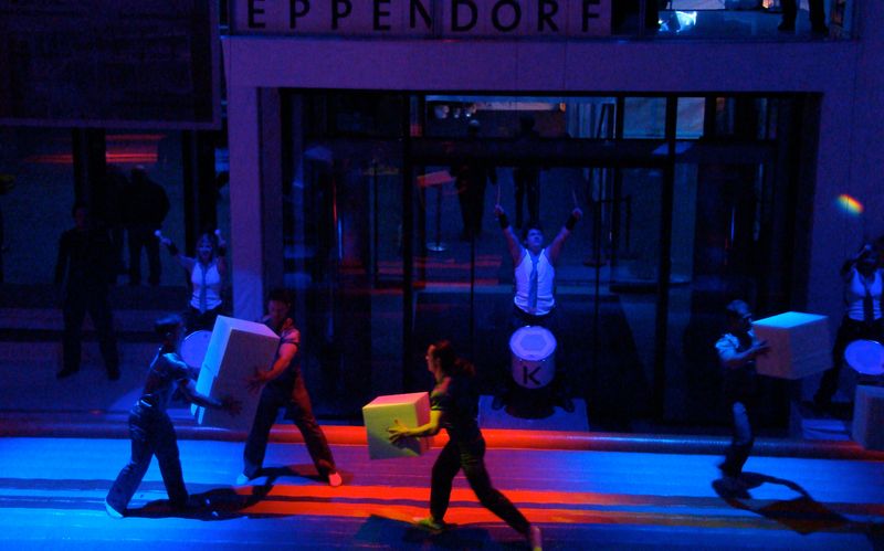 Ergänzt wurde die atemraubende Show durch drei unserer Flying Drummers, die mit 5m/s schnellen High-Speed Motorwinden in das fast 15 m hohe Eingangsportal empor schnellten und dabei kraftvoll trommelten. Die Drums wurden mit je einem Buchstaben der Kurzbezeichnung „U-K-E“ versehen, sodass auch hier der Gedanke den Namen zu inszenieren, stringent und spannend dargestellt wurde.