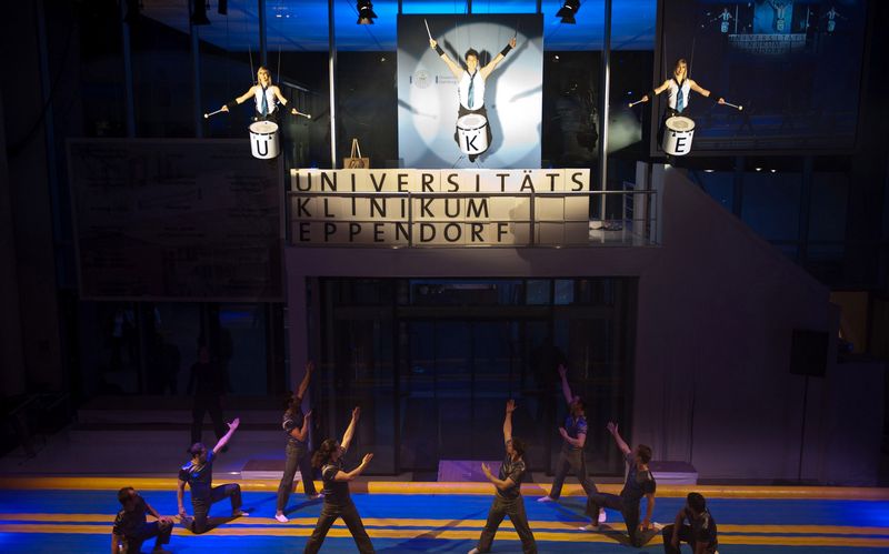 Auch der modernste Klinikneubau Europas wurde Stein für Stein erbaut. Allerdings in kürzester Zeit. Und so gefiel dem Entscheidungskomitee der Ärzte unsere Idee, dies für die Eröffnungsfeier sinnbildlich in Szene zu setzten: Sprungakrobaten visualisieren den Bauprozess mit Buchstaben-Würfeln. Kuben mit einzelnen Lettern werden dynamisch mit Flick-Flack und Salti über eine mit Luft gefüllte Trampolinbahn, eine sogenannte Airtrack, transportiert und Stück für Stück als Namensschriftzug zusammengesetzt. Das Showkonzept wurde schnell abgenickt. Die Arbeit fing für uns aber dann erst richtig an.