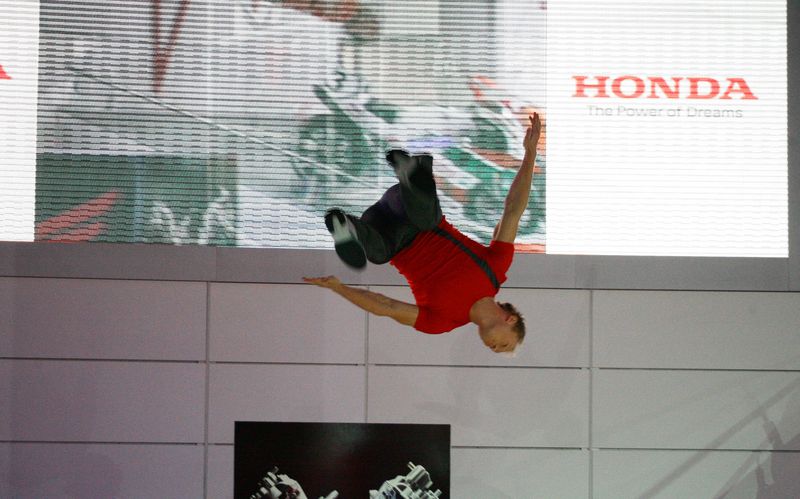 Auch die in den Folgetagen anschließende Show auf dem Messestand gestalten wir mit urbanem Flair. Die gebrandeten Würfel vom Parkdeck werden wiederholt genutzt, ergänzt wird die Szenerie von einer mobilen Gerüstinstallation und Videowänden. Die Produktwerte setzen wir aufmerksamkeitsstark in einer actiongeladenen Choreographie aus Parkour, Freerunning, Tricking und Kraftakrobatik in Szene. Zahlreiche Besucher strömen so zum Honda-Messestand.
