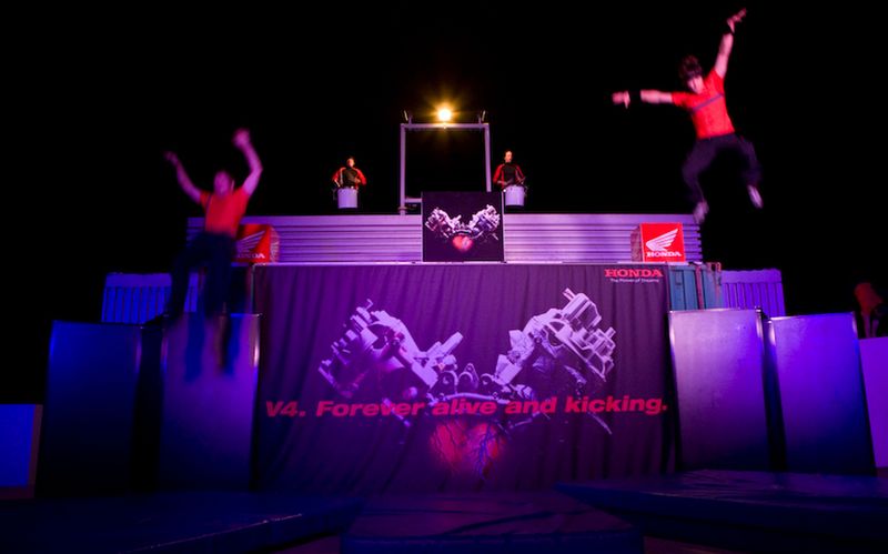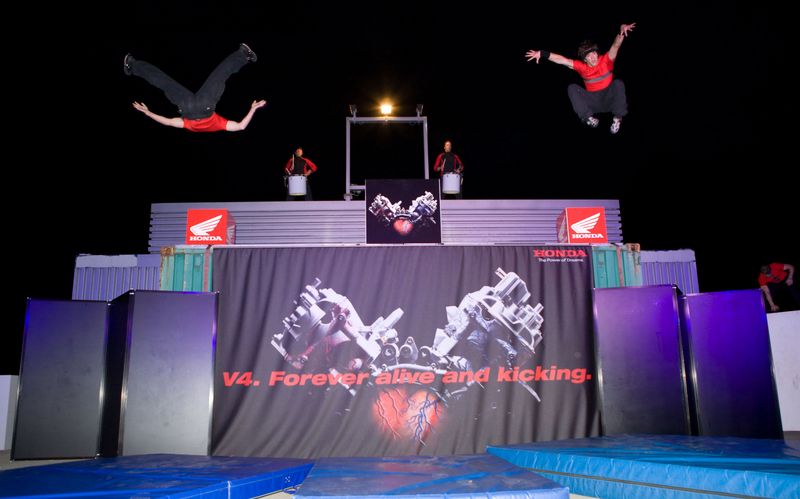 Zur Visualisierung der leistungsstarken Zweiräder präsentieren wir eine kraftvolle Parkour-Show, die von Live-Trommlern rhythmisch und lautstark unterstützt wird. Das Performance-Areal bauen wir aus Seecontainern, großen Holzwürfeln, Quadern und Niedersprungmatten. Die Container und Kuben dienen als erhöhte Plattformen und Hindernisse („Obstacles“), die von den Artisten dynamisch überlaufen und übersprungen werden. Plakativ beschildern wir die Bühnenelemente mit Bannern und Forex-Platten, auf denen das Logo und die Key-Visuals von Honda geprintet sind.