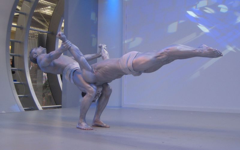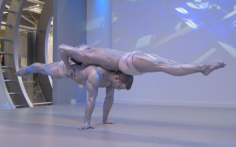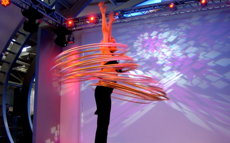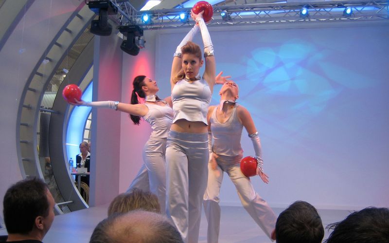 Rhythmische Sportgymnastinnen symbolisieren die Vernetzung in einer sportlichen Choreographie mit Seilen. Mit Bändern zeigen sie Flexibilität und vielfältige Einsatzmöglichkeiten auf. Die Verbindung zum Produkt wird auf der Videowand im Hintergrund hervorgehoben. Ein avantgardistischer Künstler jongliert mit einer Vielzahl von Kreiseln, ein Meister der Komplexität. Präzision und Punktgenauigkeit kommen zum Vorschein, als er einen der Kreisel auf der Scheide eines Schwertes balanciert und diesen bis auf die äußerste Spitze der Klinge gleiten lässt. Multitasking wird von einer Hula-Hoop Artistin vorgeführt, die immer mehr Reifen in unterschiedlichen Ebenen um ihren Körper kreisen lässt. Zwei muskulöse Akrobaten faszinieren mit kraftvollen Gleichgewichtspositionen, versinnbildlichen Stärke und zuverlässige Partner. Die abwechslungsreiche Performance wird mit Live-Percussion gerahmt und aufmerksamkeitsstark in Szene gesetzt.