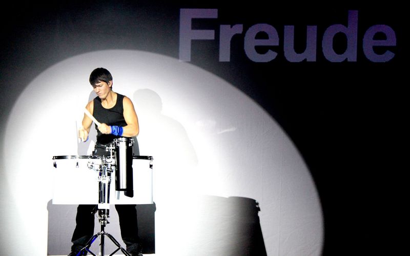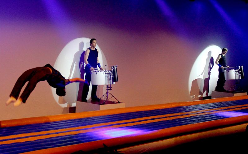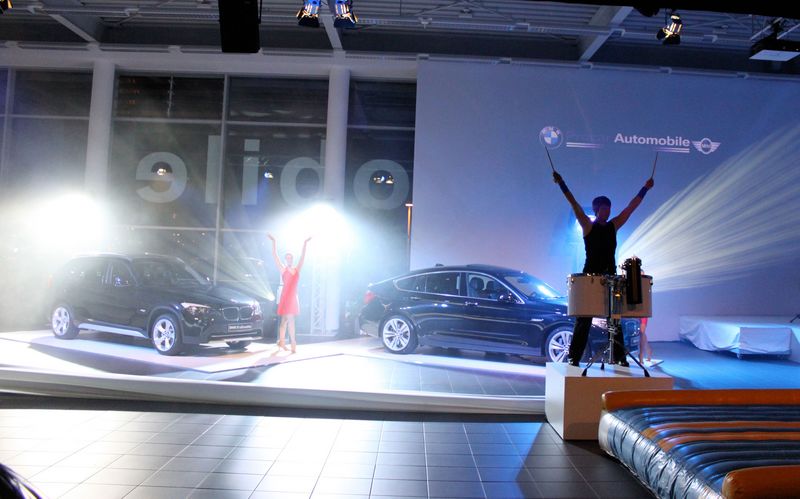 Zum spannungsvollen Auftakt lassen wir Tänzerinnen zunächst hinter einer über 20 m breiten Schattenwand auftreten, so dass nur ihre Silhouetten sichtbar sind. Vor dem Vorhang sorgen wir mit Live-Drummern und einer dynamischen sprungakrobatischen Darbietung für Stimmung. Mit einem Trommelwirbel und Kabuki-Effekt fällt der Vorhang und gibt den Blick auf die beindruckende Größe des Autohauses mit den neuesten BMW-Modellen frei.