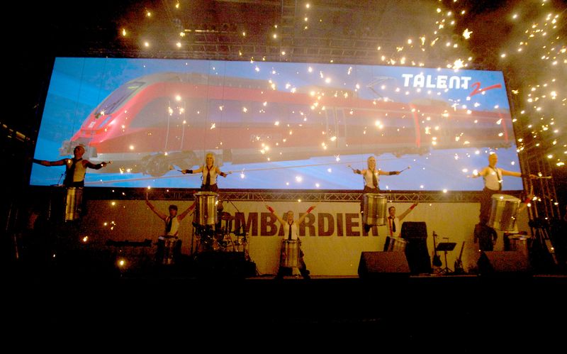 Vor der Kulisse einer aufwendig produzierten dreidimensionalen Videoanimation präsentieren wir den neuen Triebwagen von Bombadier mit unserer Flying Drummers Show. Im Unterschied zum Vorgängermodell ist der „Talent 2“ rein elektronisch angetrieben und so passt die Analogie unserer High Speed Winden perfekt ins Bild. Ergänzend marschieren Trommler hautnah am Publikum vorbei auf die Bühne und unterstützen die dynamische Darbietung mit zusätzlicher Power. Gerahmt wird die Performance mit vielfältigen Lasereffekten. Moderiert wird der Abend von Barabara Schöneberger.