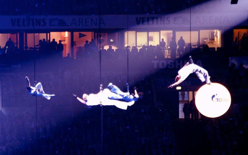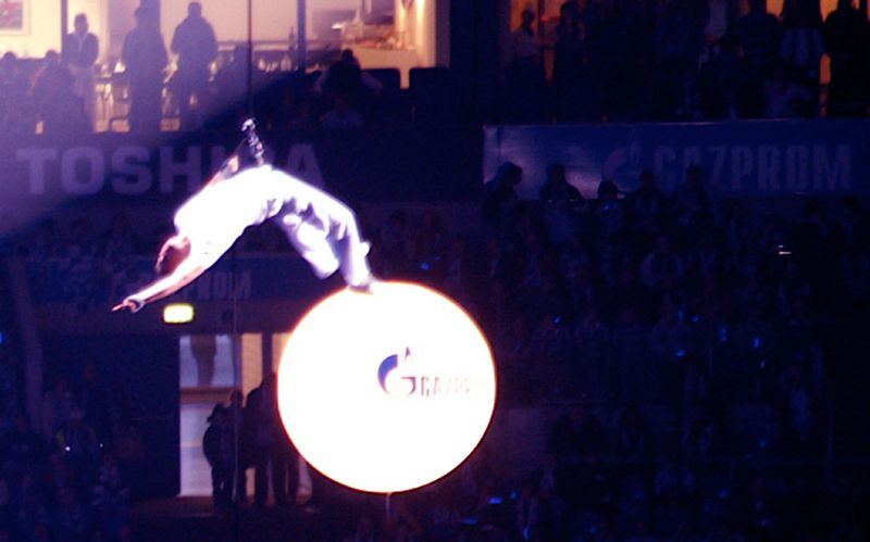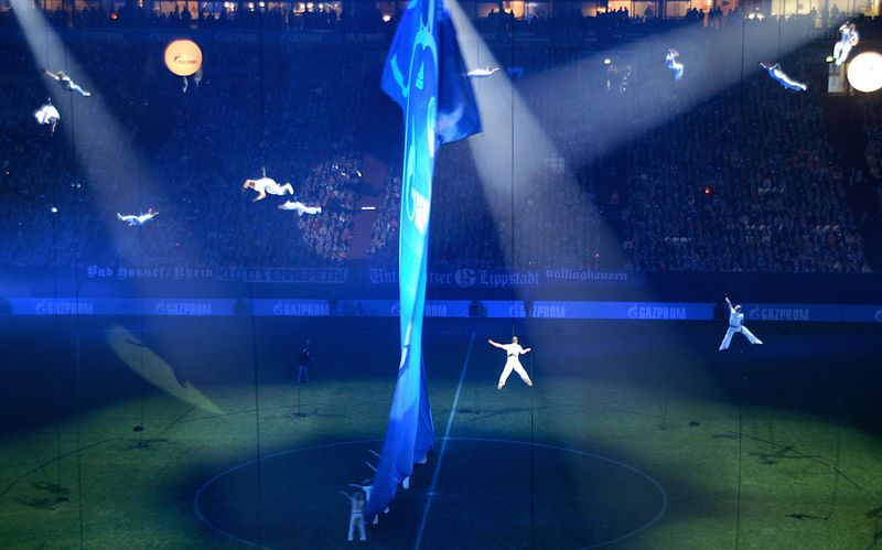 Zur Einführung der Sponsorschaft des weltweit größten Erdgasförderunternehmens Gazprom für den Bundesligisten FC Schalke 04 findet im Hexenkessel der Veltins-Arena vor ausverkauftem Stadion eine Kick-Off Aktion statt, die das neue Trikot für die Fans bildgewaltig in Szene setzt. Als Spezialisten für luftartistische Inszenierungen werden wir hierfür von der Lead-Agentur Wolf Productions beauftragt, eine spektakuläre Abseilaktion mitten im Stadion zu realisieren. Stellvertretend für die 11 Platzspieler des FC Schalke 04 agieren wir mit 11 Künstlern, die sich rund um ein riesiges Schalke Trikot mit Gazprom Branding aus über 20 m Höhe in die Arena abseilen.