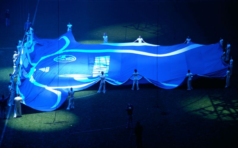 Vertikale Inszenierung eines Riesentrikots für über 50.000 Stadionbesucher