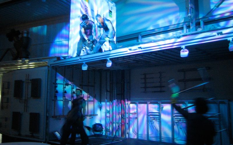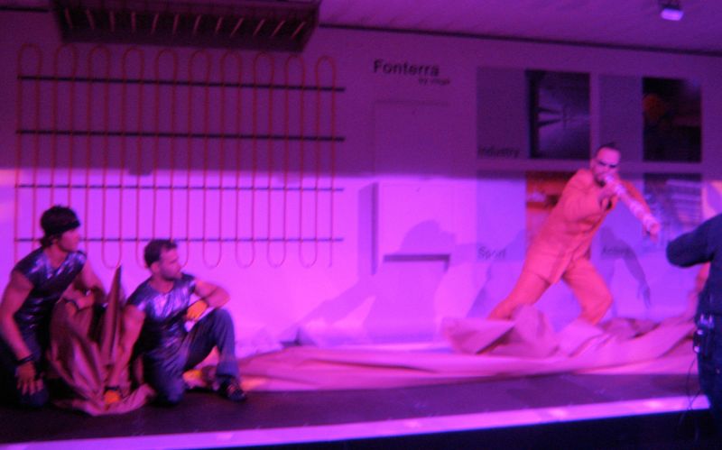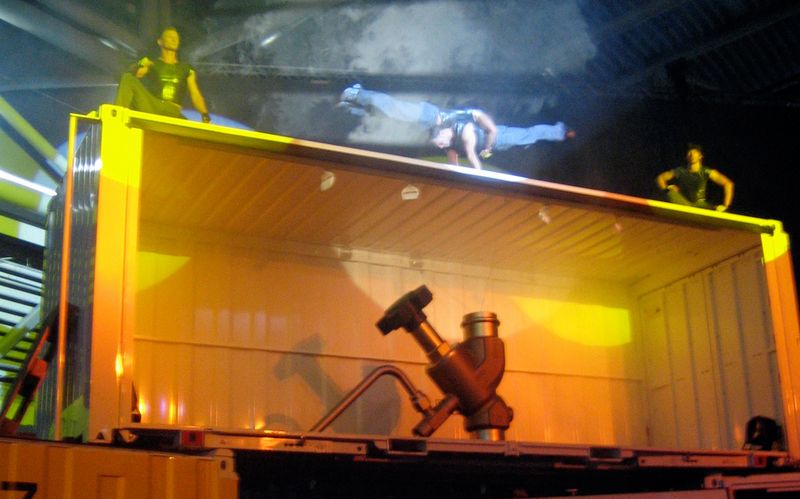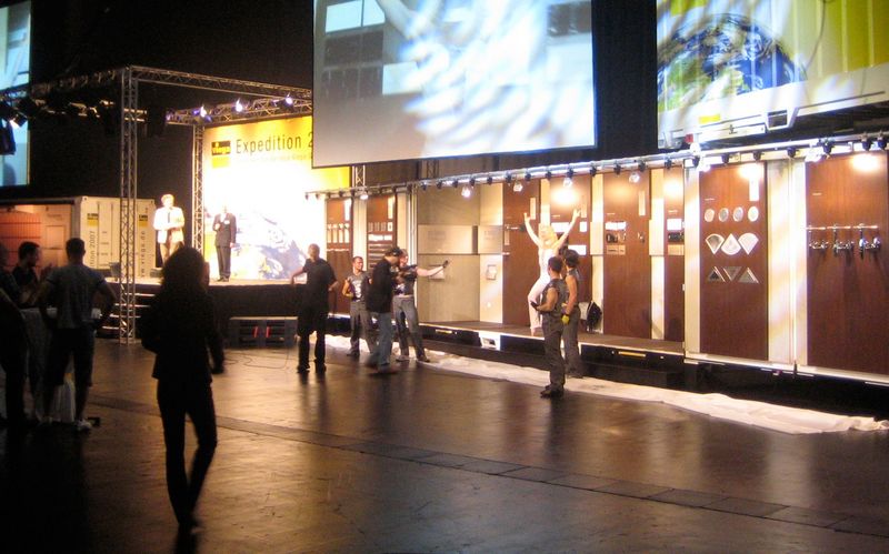 Im Sinne des Themas „Expedition“ erkunden und enthüllen Parkour-Akrobaten die in den Containern platzierten Exponate. Dabei erleben die weit über 12.000 Besucher spektakuläre Sprünge auf, über und von den Containern: Wie Spiderman laufen die Artisten an den senkrechten Wänden empor, springen aus Höhen von bis zu 6 m und bahnen sich über zusätzlich im Raum aufgestellte Palettenstapel auch den Weg mitten durch das Publikum. Das Ende ihrer einzelnen Etappen führt jeweils in die unterschiedlichen Bereiche der Systemwelt von Viega. Nach und nach öffnen die Parkour-Akrobaten die, anfangs noch geschlossenen, Container. Mit Sprüngen durch eine Papierwand oder Kabuki-Effekt wird der Blick auf die Produkte und speziell darauf angepasste Showacts der Extraklasse freigegeben. Für den Systemwelt-Container choreographieren wir eine innovative Jonglage mit Rohren, im Ventilcontainer symbolisieren zwei Kraftakrobaten die Solidität und Stärke der Rohrverbindungen. Vor dem Hintergrund eines abstrakten Konzeptansatzes präsentiert ein Didgeridoo-Musiker die vielfältigen Einsatzmöglichkeiten von Viega-Rohren. Als krönendes Highlight wird das neue Design der Vorwandtechnik mit einer sehr ästhetischen Luftring-Artistik vorgestellt.